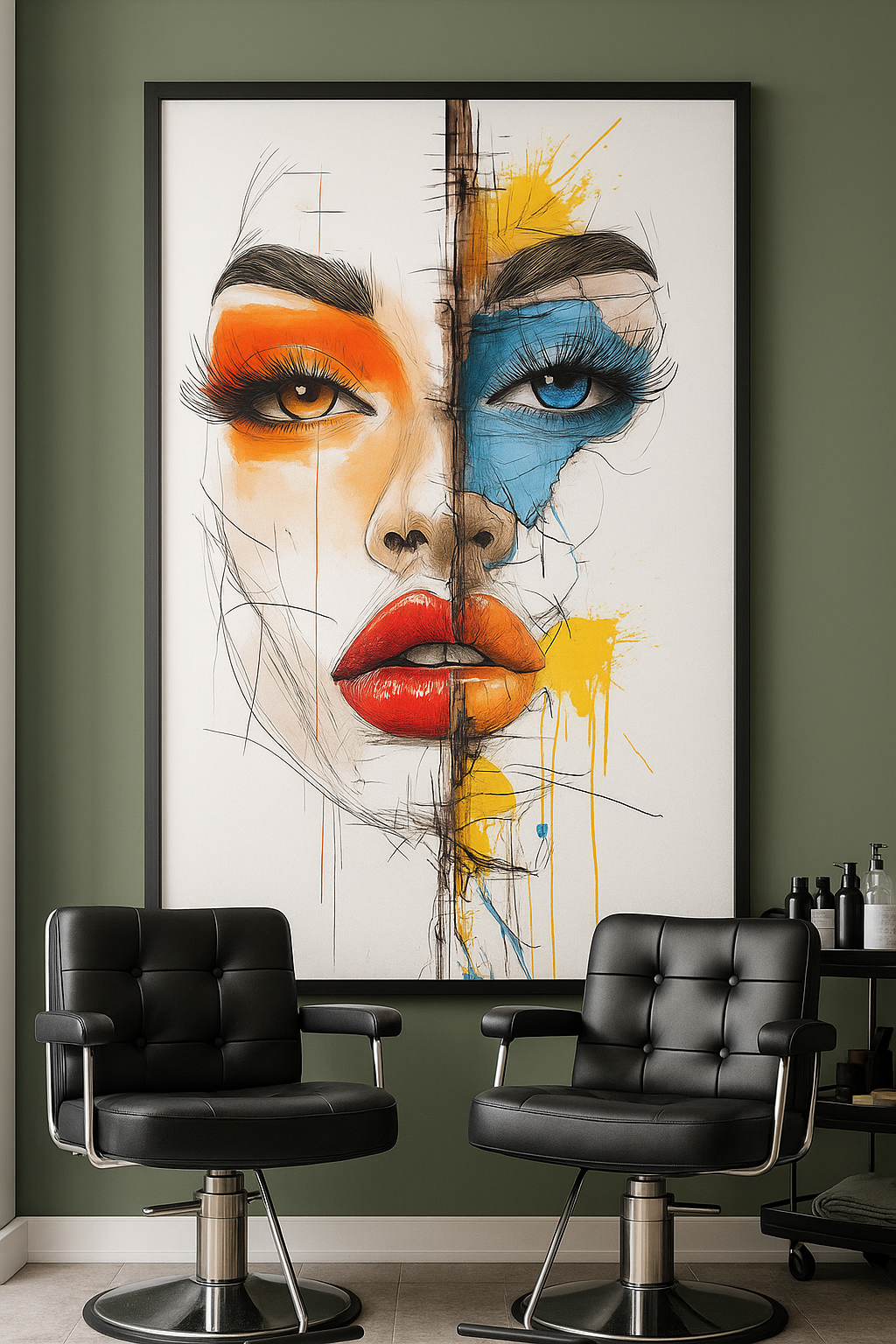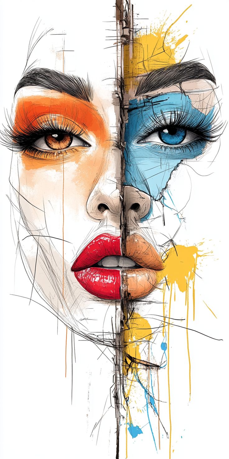 Ce tableau contemporain met en scène un visage féminin scindé en deux parties contrastées. Le côté gauche est dominé par des tons chauds (orange, rouge) qui expriment l’intensité, la passion et l’énergie, tandis que le côté droit se décline en couleurs froides (bleu, jaune) évoquant la sérénité, l’imagination et la liberté. Les traits esquissés et les éclaboussures de peinture donnent à l’œuvre une dimension urbaine et expressive, soulignant la dualité des émotions humaines