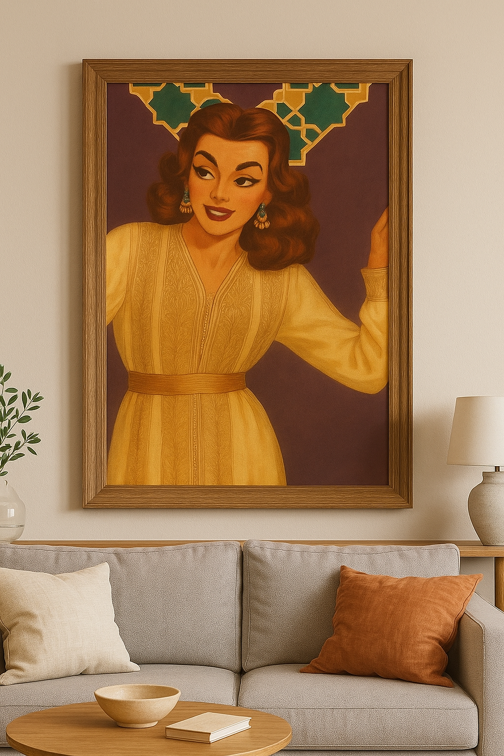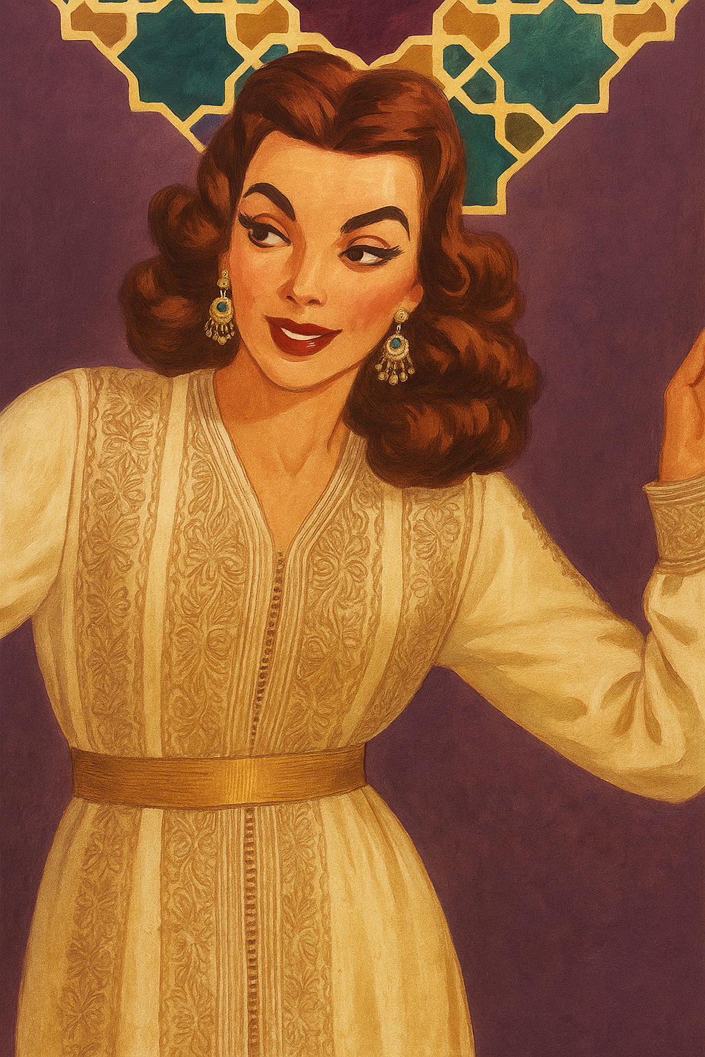Le tableau représente une femme élégante dans un style rétro marocain. Elle porte une belle takchita beige ornée de broderies fines, avec une ceinture dorée qui marque la taille. Ses cheveux sont coiffés à l’ancienne, et elle porte de longues boucles d’oreilles marocaines. L’arrière-plan géométrique rappelle l’architecture traditionnelle marocaine avec des motifs zellige sur fond violet, donnant une touche artistique authentique. Ce tableau incarne la beauté féminine marocaine avec une touche vintage et noble.
