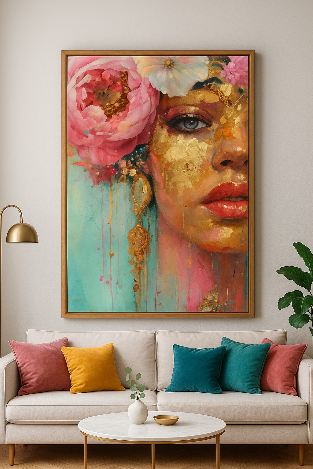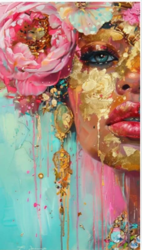 Un tableau artistique vibrant et stylisé représentant une femme au regard perçant, sublimée par des touches dorées, des fleurs éclatantes et des textures fluides. Les tons dominants — rose, turquoise ou — apportent un contraste fort et élégant.