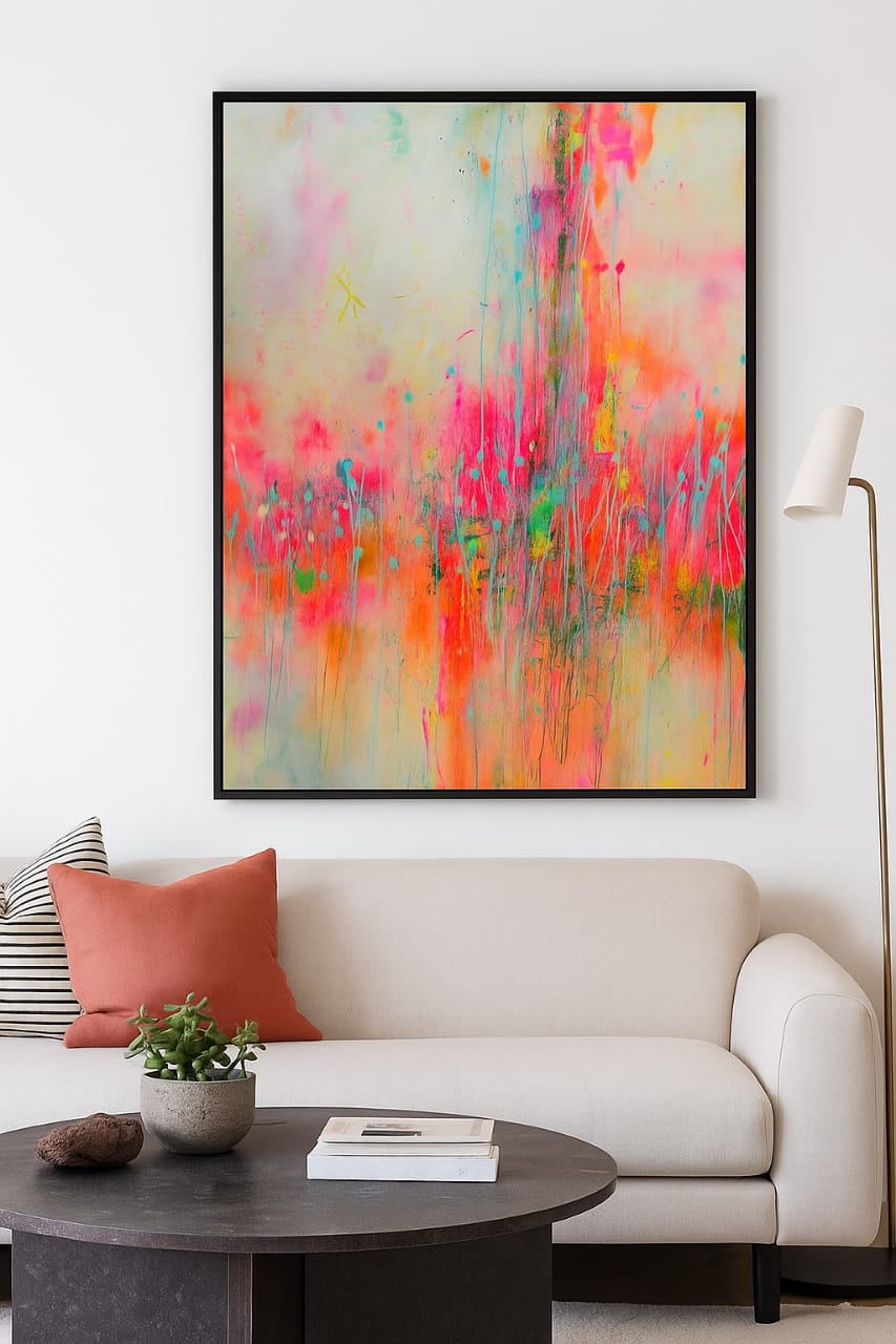 Tableau abstrait moderne aux couleurs vives, mêlant des éclaboussures et coulures de rose, orange, bleu et vert, créant une atmosphère dynamique et lumineuse idéale pour apporter une touche artistique contemporaine à un salon.