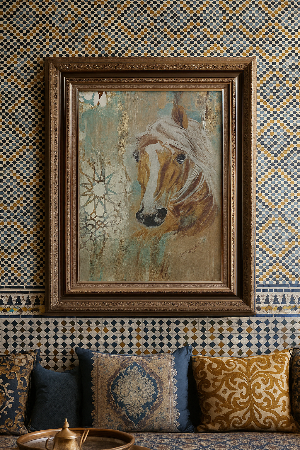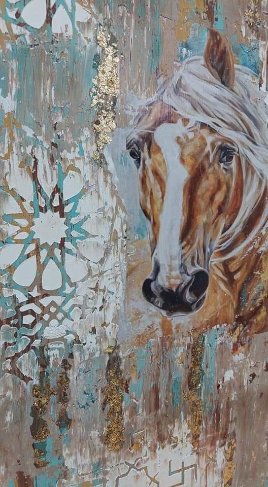 Cette œuvre artistique représente la tête d’un cheval à la crinière blanche, peinte avec un grand réalisme et une expression intense. L’arrière-plan mêle des motifs géométriques inspirés du zellige marocain, des touches dorées et des effets de matière créant une ambiance riche, texturée et contemporaine.