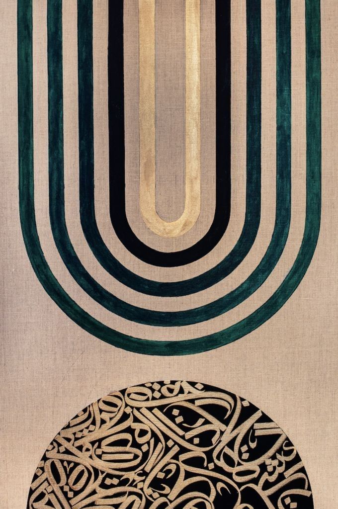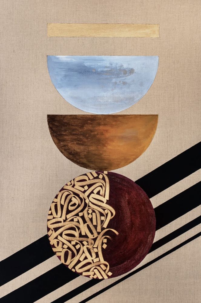À travers une composition épurée mêlant formes géométriques (cercles, arcs, demi-cercles) et calligraphie abstraite, l’artiste transmet une quête d’équilibre intérieur et de connexion au divin.