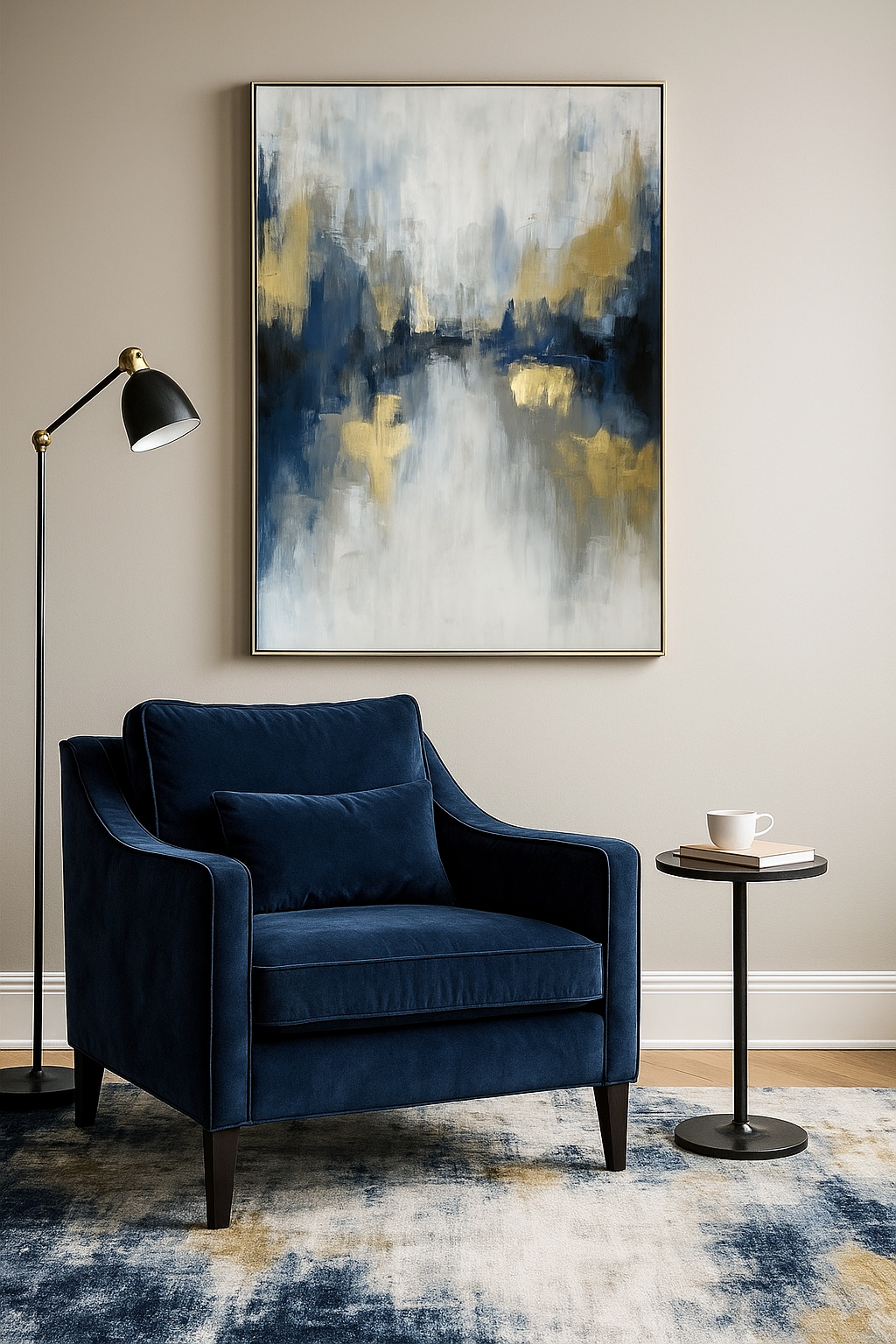 Tableau abstrait moderne aux tons bleu marine, gris doux et touches dorées, évoquant un paysage urbain ou un reflet aquatique dans une ambiance élégante et apaisante.