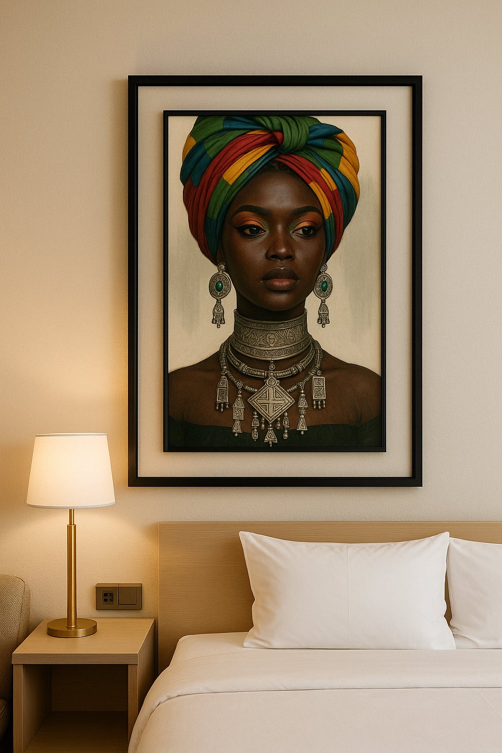 Cette œuvre contemporaine célèbre la majesté féminine à travers une figure africaine drapée de symboles identitaires forts. Le turban aux couleurs vives évoque l'unité panafricaine, tandis que les bijoux amazighs — richement détaillés — témoignent d'un héritage millénaire ancré dans les traditions du Maghreb. Par son regard affirmé et sa posture droite, la figure centrale incarne la fierté, la mémoire et la dignité des femmes berbères. Une composition qui allie puissance esthétique et profondeur culturelle, invitant le spectateur à une réflexion sur la transmission, la beauté et l'identité.